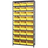 Quantum steel shelving system with bins provides an economical small parts storage system to keep parts easily accessible. STORE-MORE 6in.H bins hold up to 68% more than standard 4in. shelf bins. Shelving Type: Steel shelving, Bin Type Included: Store-More shelf bins, Dimensions L x W x H (in.): 12 x 36 x 75, Bins Included (qty.): 27 (#179164), Shelves (qty.): 10, Bin Color: Yellow, Material Type: FDA approved polypropylene, Bin Dimensions L x W x H (in.): 11 5/8 x 11 1/8 x 6, Weight Capacity (lbs.): 400 per shelf, Bin Divider Item Number (s): 179154 Open hopper front bins with label area provide fast access to stored items All-in-one unit is easy to clean and will not rust or corrode Heavy-duty high grade shelving offers a 400-lb. capacity per shelf 36in.W shelving has smooth powder-coat finish